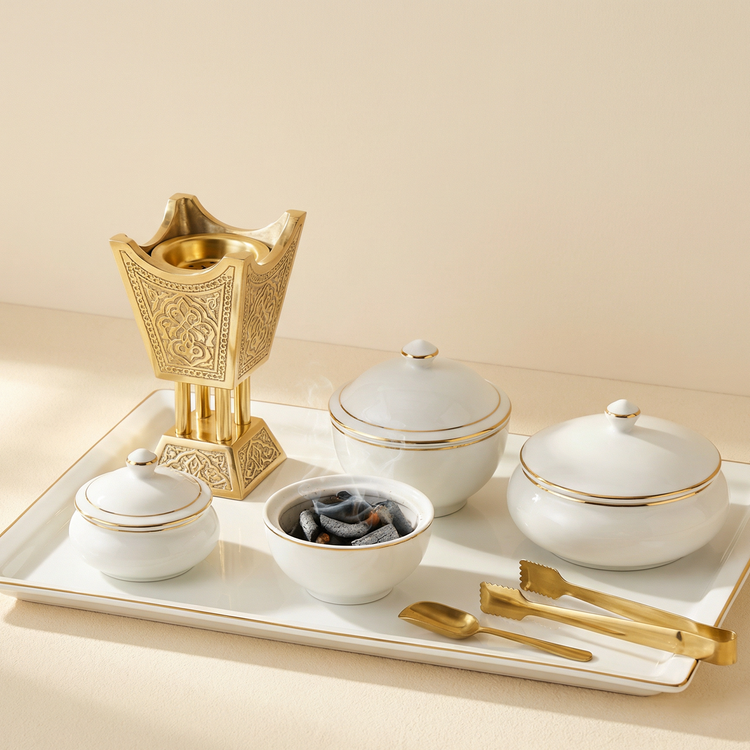 طقم مباخر «حكاية الرخام» – رخام طبيعي مع وعاء خشبي للدخون