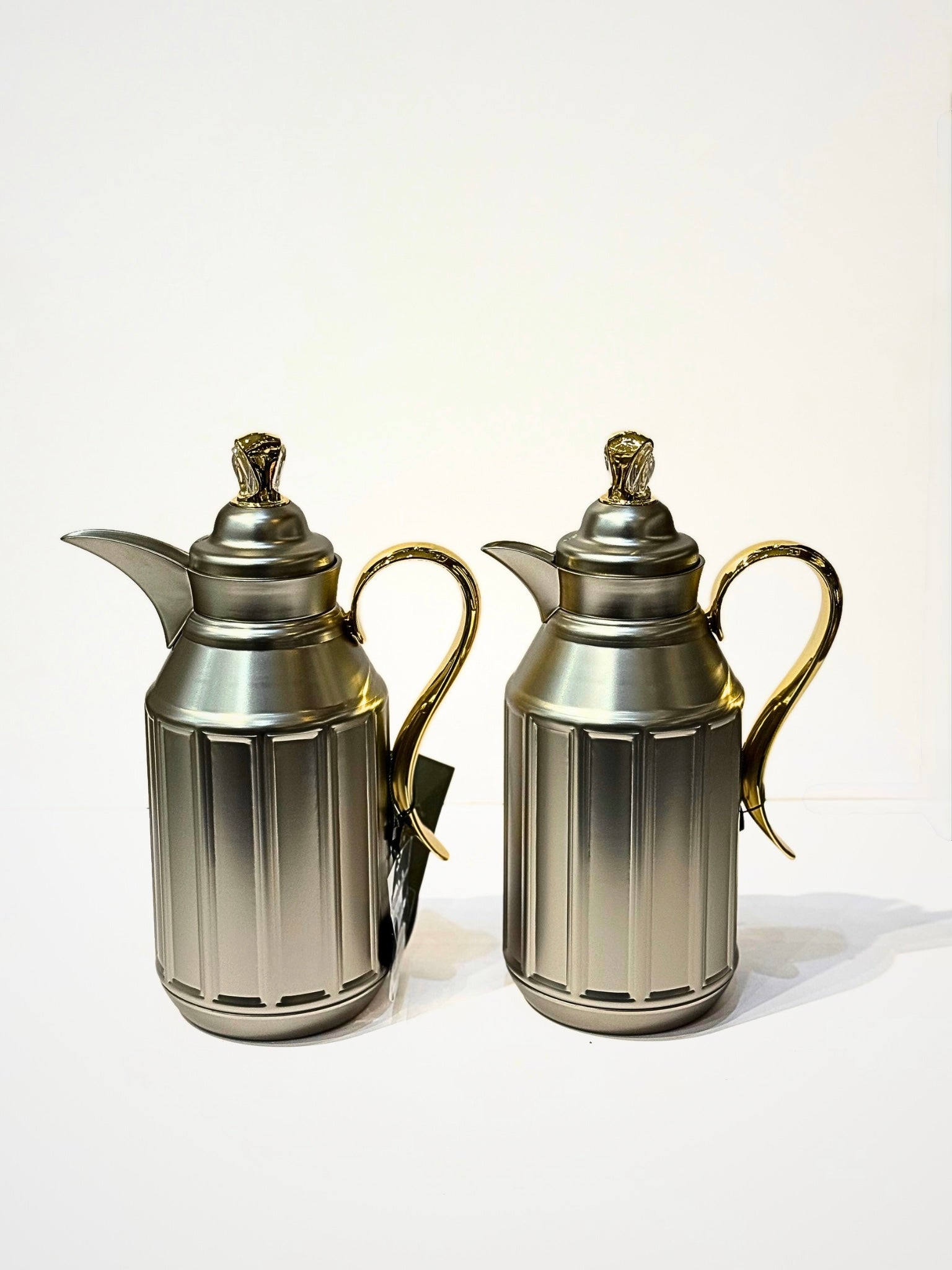 طقم دله شاي وقهوه فاخر يجمع بين الأناقة والعملية. يتميز بتصميم ثنائي الطبقات حيث الغلاف الخارجي من الستانلس ستيل المتين والداخل من الزجاج النقي، مما يحافظ على درجة حرارة المشروبات ويسهل مراقبة المستويات. بسعة لتر لكل دلة، يوفر كمية كافية لتقديم الشاي والقهوة بأناقة لعائلتك وضيوفك. خيار مثالي للمناسبات والاستخدام اليومي