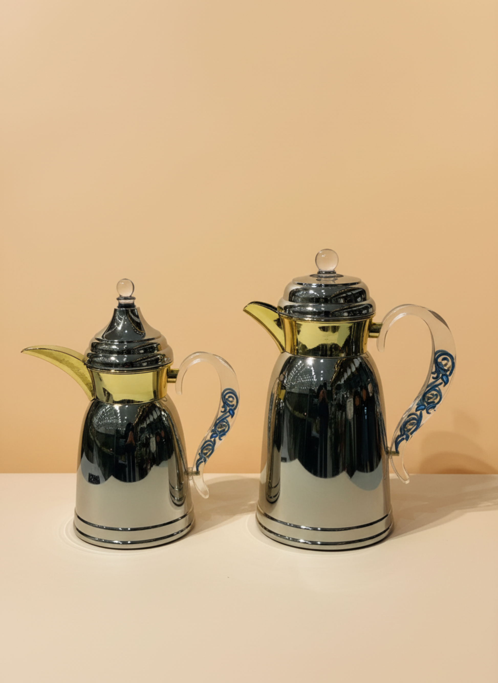 طقم دله شاي وقهوه فاخر يجمع بين الأناقة والعملية. يتميز بتصميم مزدوج الطبقات حيث الزجاج من الداخل يحافظ على نقاء المشروب، والستانلس ستيل من الخارج يوفر متانة وحماية فائقة. يشمل الطقم دلتين بمقاسات مختلفة: 1 لتر و700 لتر، مما يناسب احتياجاتك المتنوعة سواء لتقديم الشاي أو القهوة. مثالي للاستخدام اليومي والمناسبات الخاصة، يجمع بين الجودة العالية والأداء الموثوق