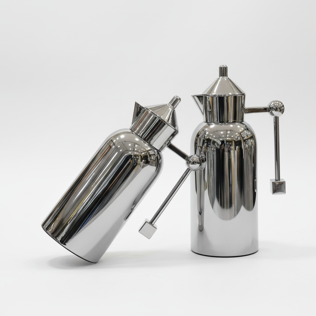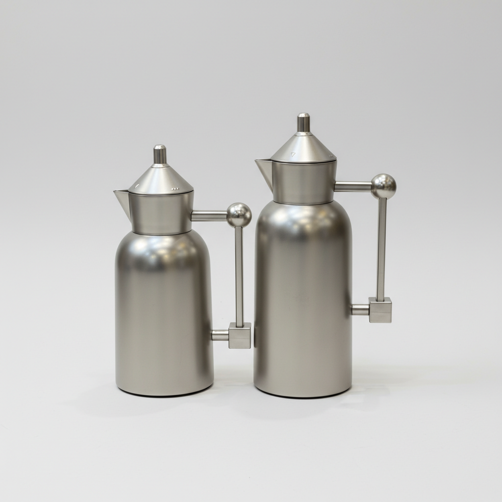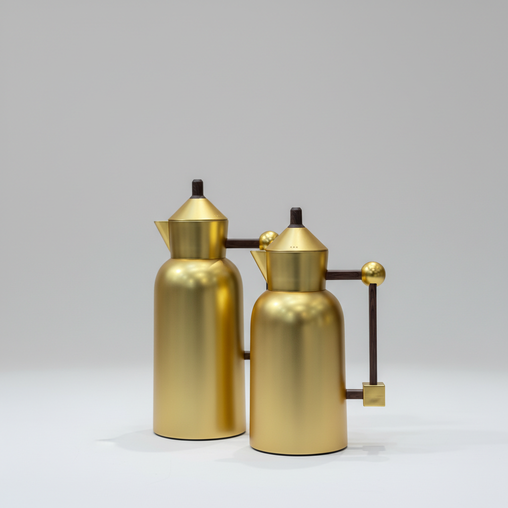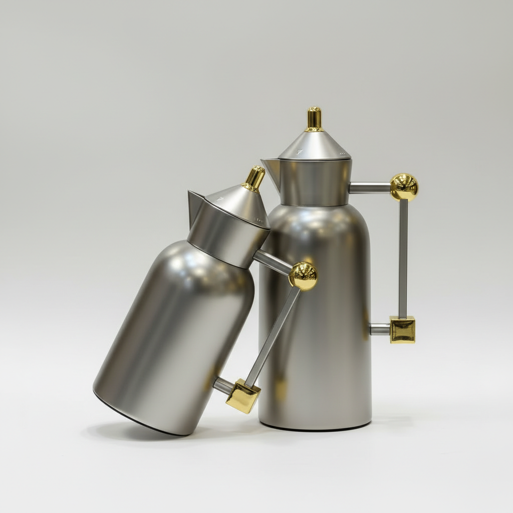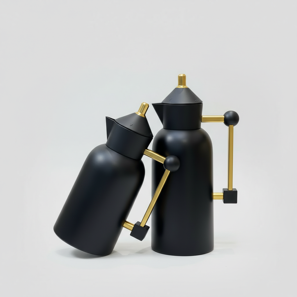 طقم دلتين قهوة وشاي بسعة 1 لتر و700 مل، تصميم هندسي عصري باللون الأسود المطفي مع تفاصيل ذهبية فاخرة، يحافظ على حرارة القهوة والشاي لساعات ويكمّل ديكور المجلِس الحديث.